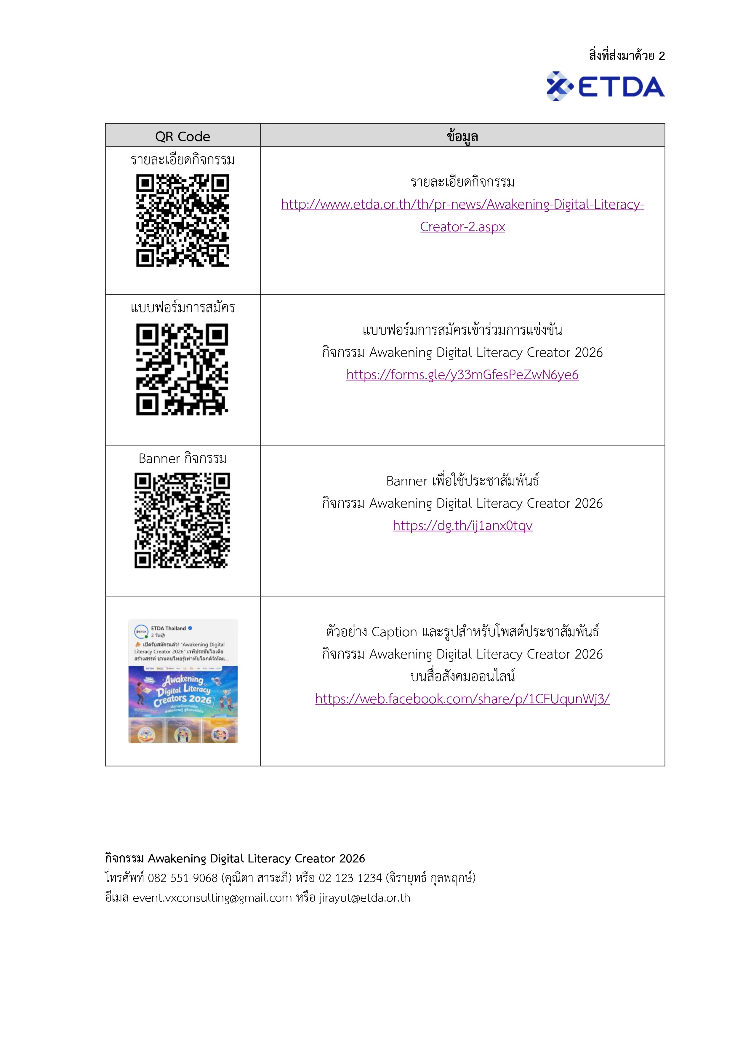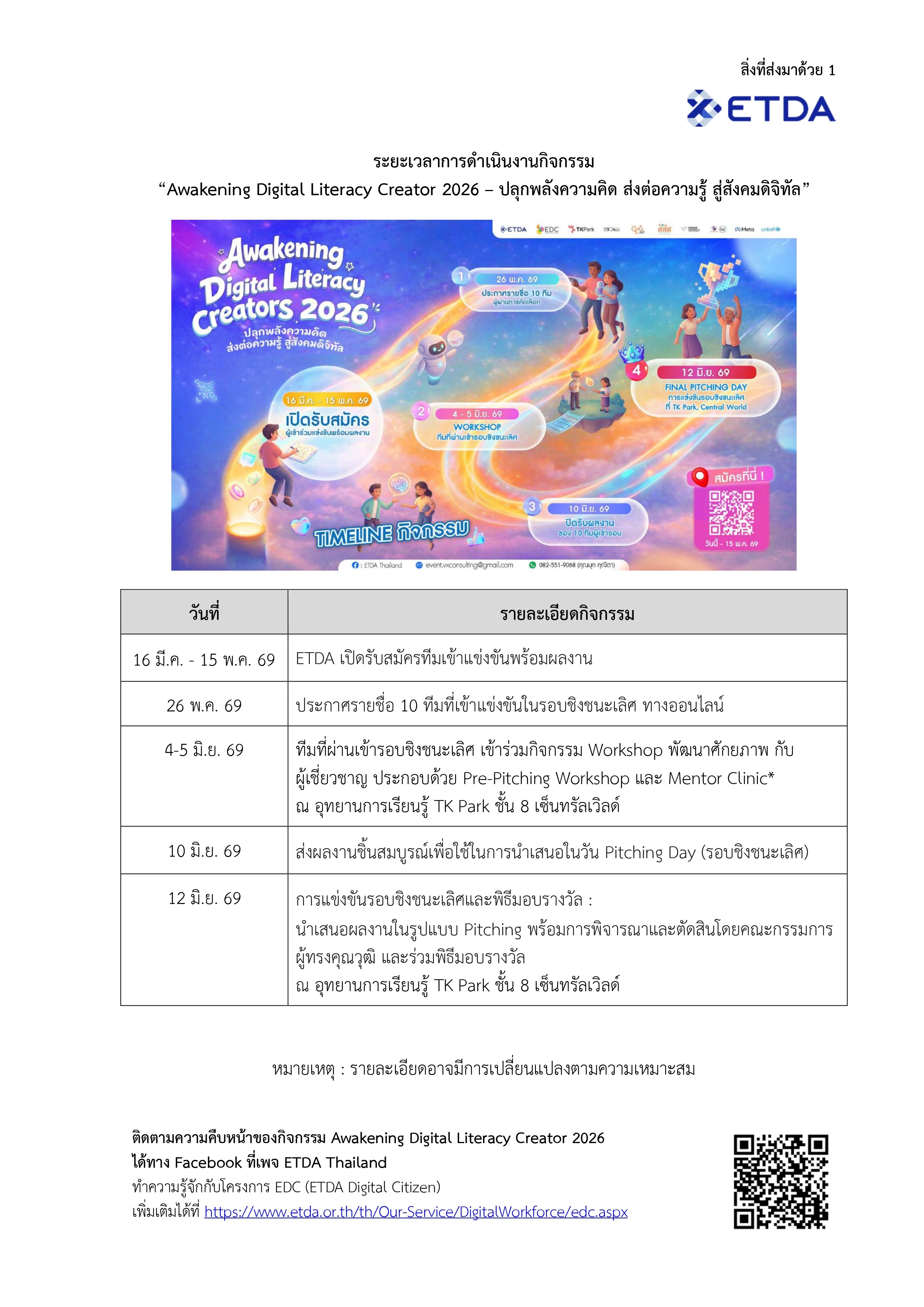 สำนักงานพัฒนาธุรกรรมทางอิเล็กทรอนิกส์ หรือ สพธอ. กระทรวงดิจิทัลเพื่อเศรษฐกิจและสังคม มีภารกิจในการส่งเสริมและสนับสนุนให้ประชาชนใช้อินเทอร์เน็ตและเทคโนโลยีอย่างรู้เท่าทัน สร้างสรรค์ และมั่นคงปลอดภัย โดยในยุคที่ “ทักษะดิจิทัล” เป็นหัวใจสำคัญของการใช้ชีวิต การเรียน และการทำงาน สพธอ. ได้ดำเนิน โครงการ ETDA Digital Citizen (EDC) เพื่อพัฒนา “พลเมืองดิจิทัลคุณภาพ” มุ่งเน้นการเสริมสร้างทักษะ Digital Literacy ครอบคลุมการรู้เท่าทันเทคโนโลยี การใช้งานดิจิทัลอย่างปลอดภัย ตลอดจนการประยุกต์ใช้เทคโนโลยีปัญญาประดิษฐ์ (AI) ในชีวิตประจำวัน พร้อมพัฒนาเครือข่าย EDC Trainer เพื่อถ่ายทอดองค์ความรู้สู่ภาคส่วนต่าง ๆ เพื่อเปิดโอกาสให้ผู้ที่ผ่านการอบรมสามารถนำความรู้มาต่อยอดสู่การสร้างสรรค์แนวคิดและกิจกรรมที่เป็นประโยชน์ต่อสังคม สพธอ. จึงได้จัดกิจกรรมการแข่งขัน EDC Pitching อย่างต่อเนื่อง และในปี 2569 นี้ ได้ร่วมกับสถาบันอุทยานการเรียนรู้ (TK Park) จัดกิจกรรมภายใต้ชื่อ “Awakening Digital Literacy Creator 2026 – ปลุกพลังความคิด ส่งต่อความรู้สู่สังคมดิจิทัล” เพื่อเปิดพื้นที่ให้ผู้เข้าร่วมพัฒนาแนวคิดแคมเปญหรือกิจกรรมด้าน Digital Literacy ที่สามารถนำไปใช้ได้จริง โดยมุ่งส่งเสริมการพัฒนาจาก “ผู้ใช้” (User) สู่ “ผู้สร้าง” (Creator) ที่มีความรับผิดชอบต่อสังคมดิจิทัล โดยกิจกรรมดังกล่าวเปิดรับสมัครผู้เข้าร่วมการแข่งขันตั้งแต่วันที่ 16 มีนาคม – 15 พฤษภาคม 2569