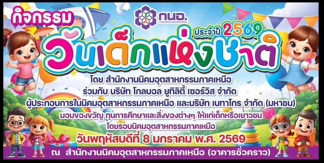 สนน. ร่วมกับผู้ประกอบการในนิคมฯภาคเหนือ, บริษัท โกลบอล ยูทิลิตี้ เซอร์วิส จำกัด(Gusco) และบริษัทเบทาโกร จำกัด (มหาชน) จัดกิจกรรมวันเด็กแห่งชาติประจำปี 2569 โดยมีนายพิรัฐพล ตนานนท์ ผู้อำนวยการสำนักงานนิคมอุตสาหกรรมภาคเหนือเป็นประธานในการเปิดกิจกรรมในวันเด็กปีนี้ โดยมีรูปแบบการจัดกิจกรรมดังนี้