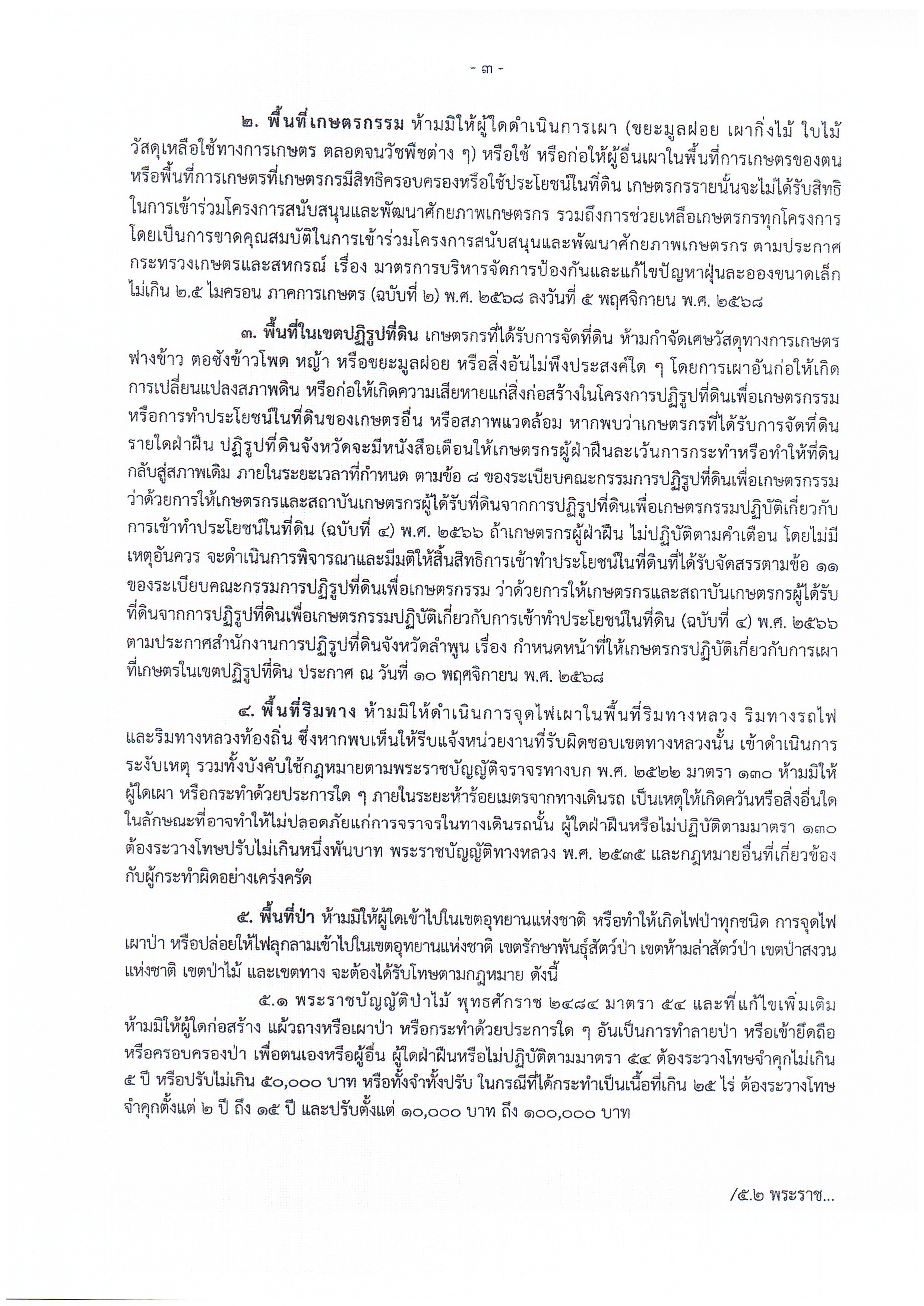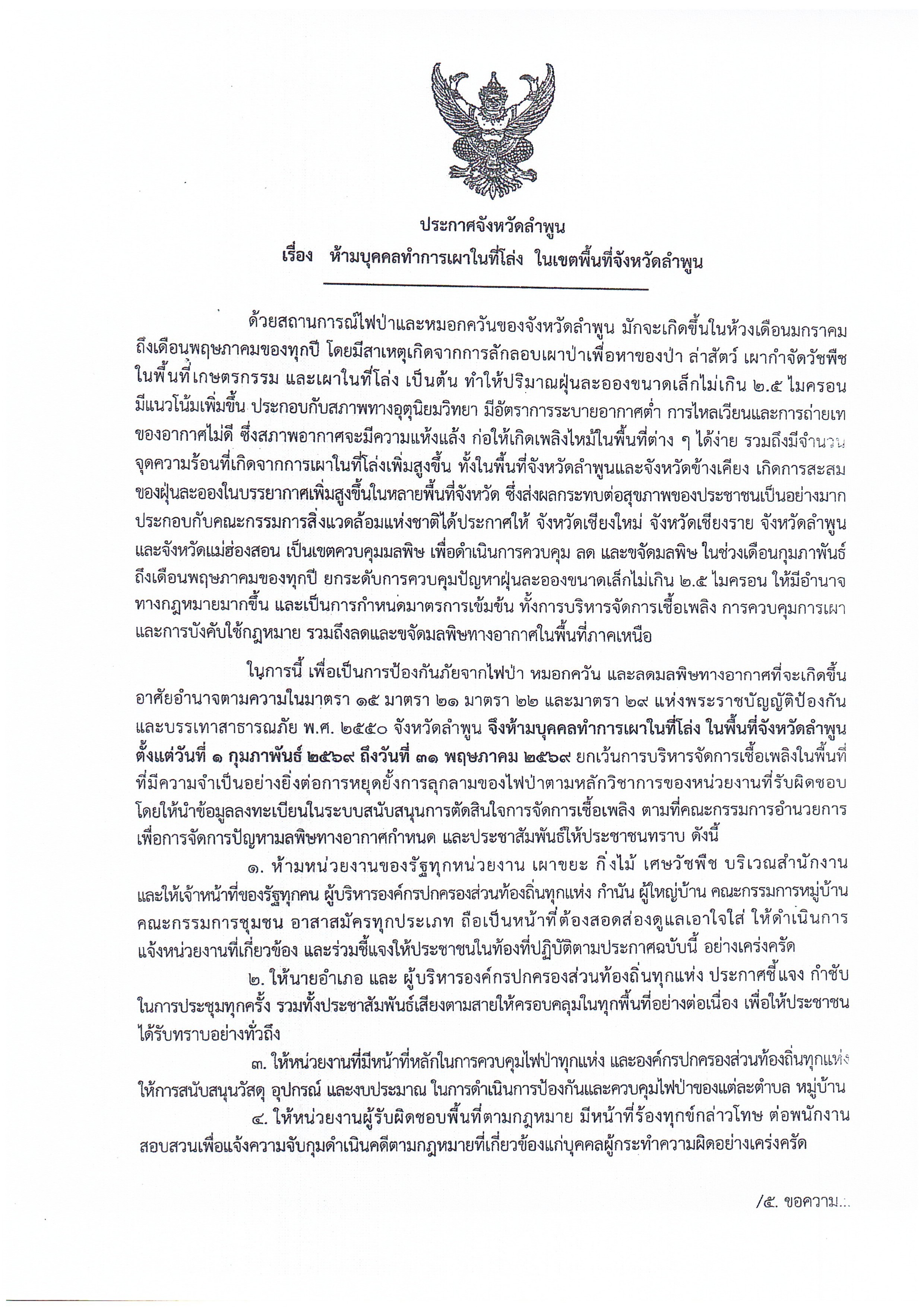 ห้ามบุคคลทำการเผาในที่โล่ง ในพื้นที่จังหวัดลำพูน
